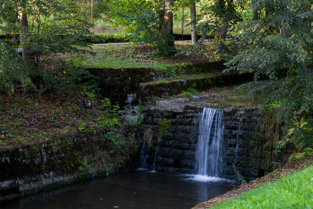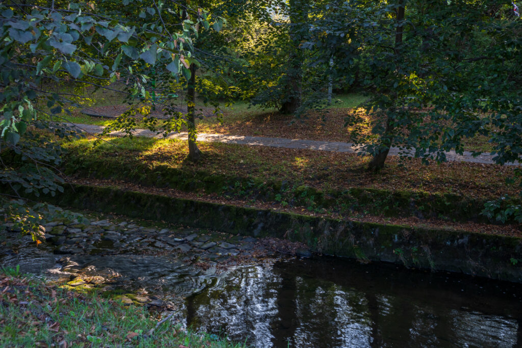 Kierunek Jaszowca wybrałem m.in. dlatego, że chciałem sfotografować omawiane na filmie ośrodki wczasowe, ale nie wziąłem pod uwagę upływu czasu i tego, że okoliczna roślinność wyrosła trochę bardziej niż bym chciał – ze ścieżki spacerowej niewiele było widać. Na pocieszenie zostało mi parę zdjęć potoku w niemal już jesiennym anturażu.