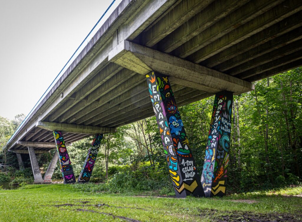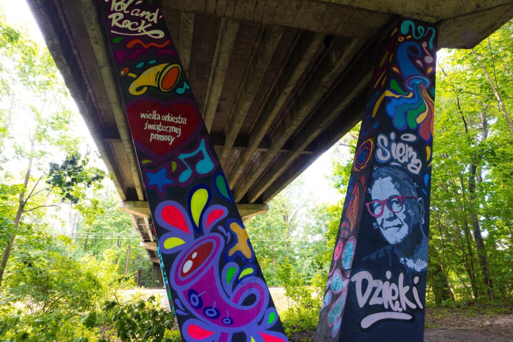 Do niedawna wyasfaltowana ścieżka prowadziła kawałek za ujściem potoku Poniwiec do Wisły, a potem zamieniała się w kamienistą drogę do dzielnic Zawodzie i Jaszowiec. W tym roku odkryłem, że została wyasfaltowana na całej długości. Nie pokonałem co prawda całej, ale od centrum jest to spokojnie ponad 3 kilometry. Zresztą i bez tego, w trakcie całego weekendu zrobiłem spacerując jakieś 30 km. Po drodze warto zwrócić uwagę na bardzo ciekawy przypadek street-artu. Niedawno grafficiarze pomalowali wsporniki znajdującego się pod koniec ścieżki wiaduktu w motywy kojarzące się z Jerzym Owsiakiem i Wielką Orkiestrą Świątecznej Pomocy, tworząc pierwszy punkt Szlaku WOŚP – gorąco polecam zobaczyć.
