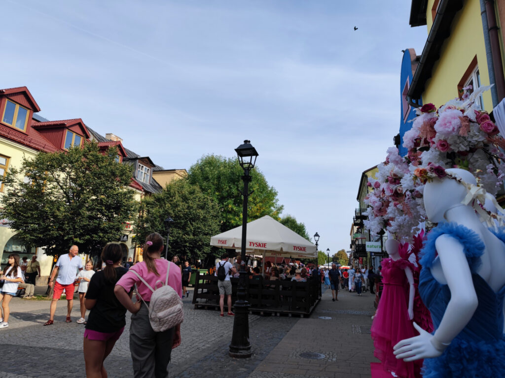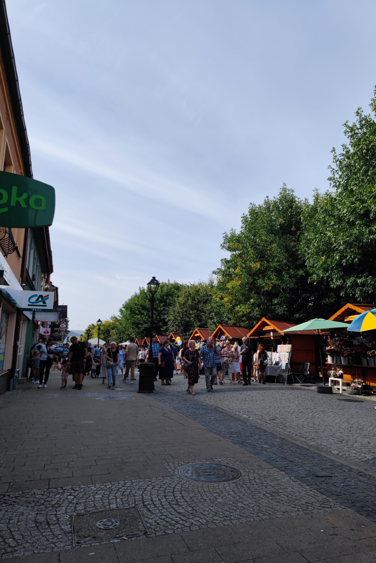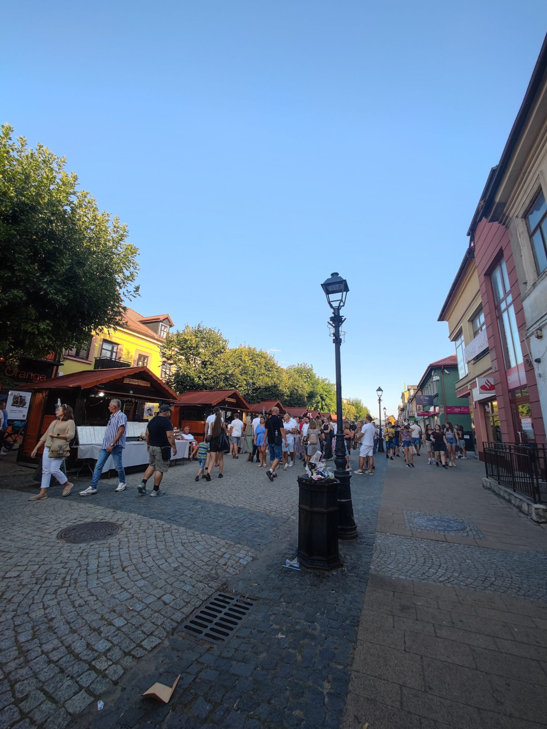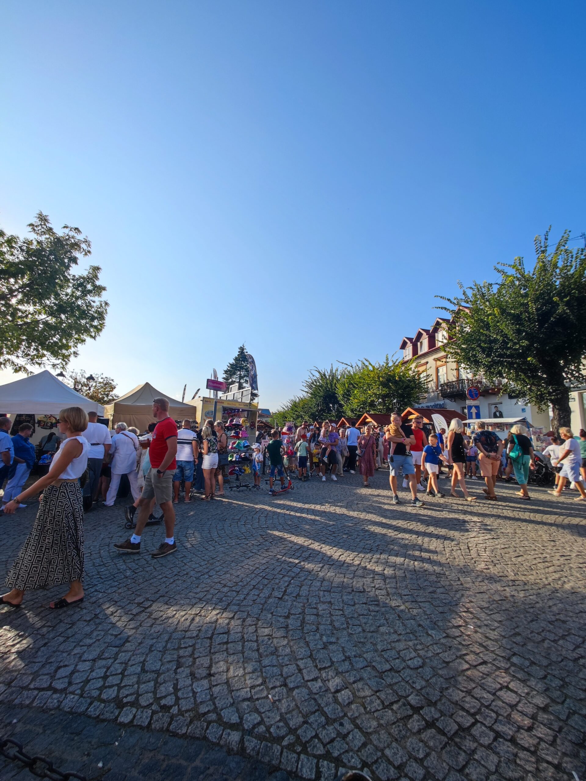 Jeśli chodzi o poruszanie się po uliczkach wokół centrum to jest dość standardowo jak na mniejszą miejscowość przystało – w miarę fajne chodniki oraz wybrukowane kostką ulice. Rozłożenie stoisk niestety wymusza poruszanie się po tej brukowanej ulicy, co w połączeniu ze sporym tłumem sprawia, że trzeba uważać, żeby na coś lub kogoś nie wpaść – ja rozumiem, że bruk dodaje uliczkom klimatu, ale zdecydowanie nie jest to mój ulubiony typ nawierzchni. Do tego gdzieniegdzie leżały dodatkowe przeszkody w postaci kabli i specjalnych progów, które je osłaniają. Nie są jakimś specjalnym problemem dla kogoś w miarę silnego, dopóki nie próbujesz jechać z czymś do picia – ja wożę napoje albo w przyczepionym do wózka uchwycie, albo trzymając kubek czy butelkę pomiędzy nogami i w takim przypadku o rozlanie napoju na takim progu jest bardzo łatwo.